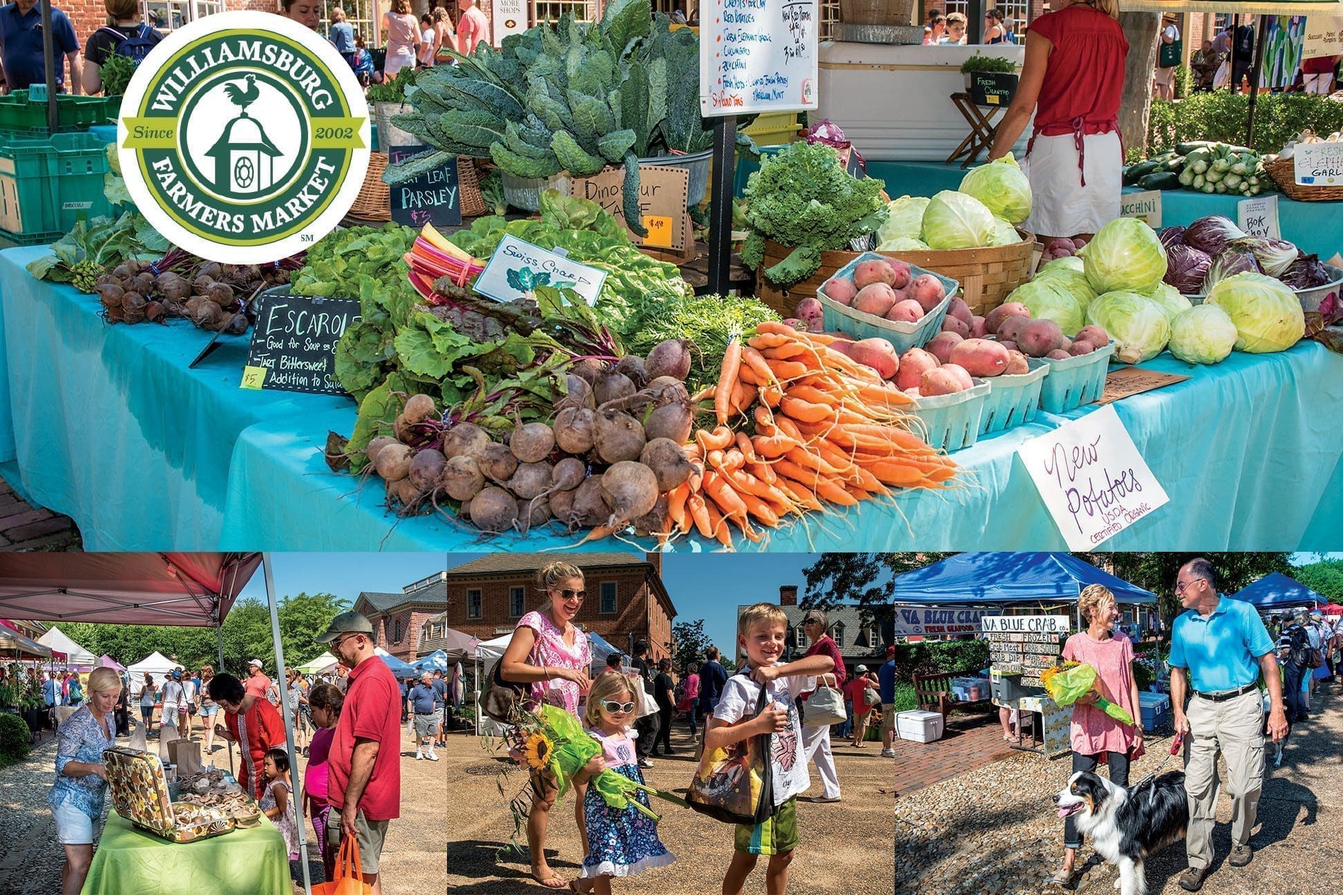 The Williamsburg Farmers Market features 40 vendors focused on produce, prepared food and farm-related products grown or made in Virginia and has been serving between 1,000 and 1,500 people on any given Saturday. The market’s live music and great location at Merchant’s Square in Colonial Williamsburg make it both a local favorite and an attraction for visitors from across the country and around the world. In operation since 2002, the market offers a diversity of products, bringing together farmers, bakers, watermen, and a variety of prepared food vendors. Join us at our open-air market each week to share in the celebration of local, fresh food and community. The Williamsburg Farmers Market does not allow reselling. That means that the people doing the growing and producing are the same smiling folks who sell those products to you at Market. Got a question about how your food is grown? You’re at the right place because at the Williamsburg Farmers Market, the salesperson is also the farmer! Each week brings new produce, vendors, music, events and fun!
