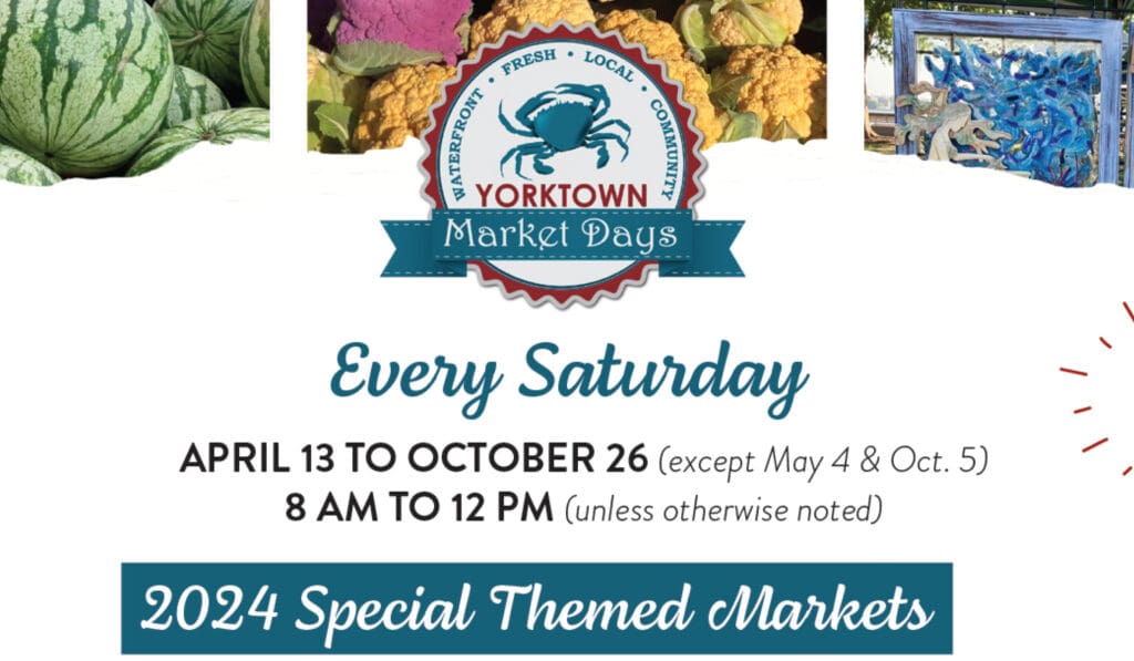 Experience Yorktown Market Days, Hampton Roads’ picturesque farmers market along the York River. Discover diverse vendors, local artists, and food trucks at Riverwalk Landing. Browse seasonal produce, seafood, meats, breads, soaps, candles, honey, gourmet dog treats, and more! The market moves to the Water Street Parking Terrace during inclement weather.