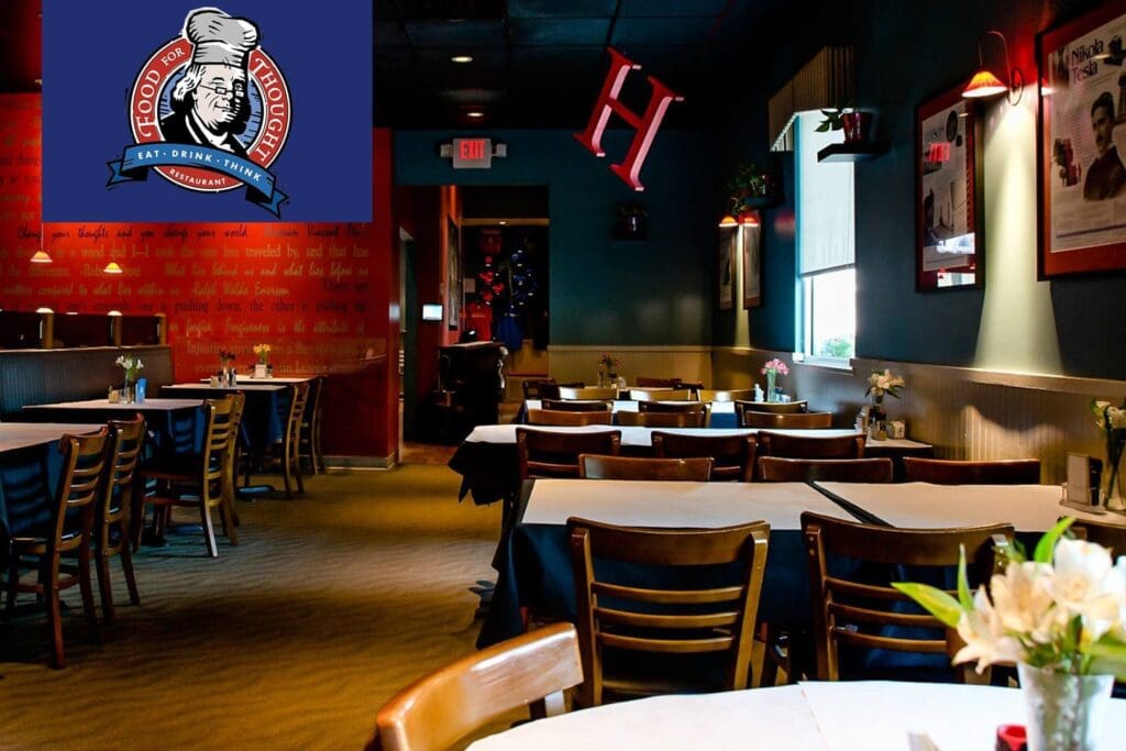 The décor features biographical pictures of inventors, scientists, and social leaders while the walls display thought-provoking quotes used to set the tone for a positive and enjoyable dining experience. Discussion cards are placed upon the tables to help spur thought-charged conversation. Food For Thought’s menu is as diverse as the great thinkers themselves. Our diner’s choices vary from classic